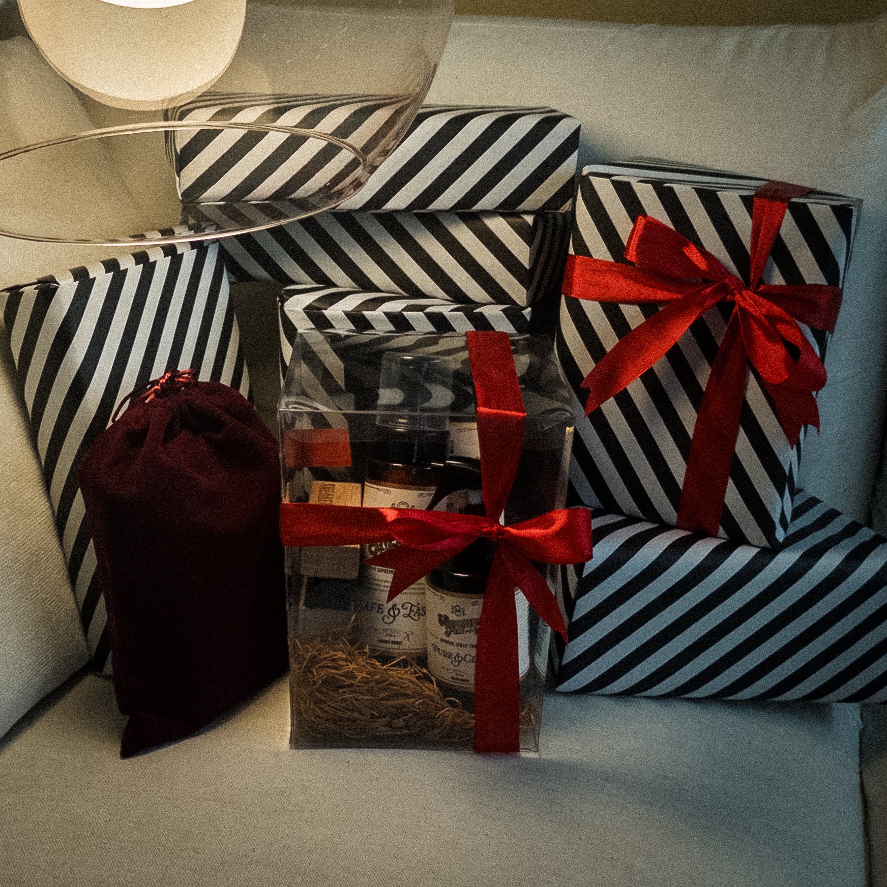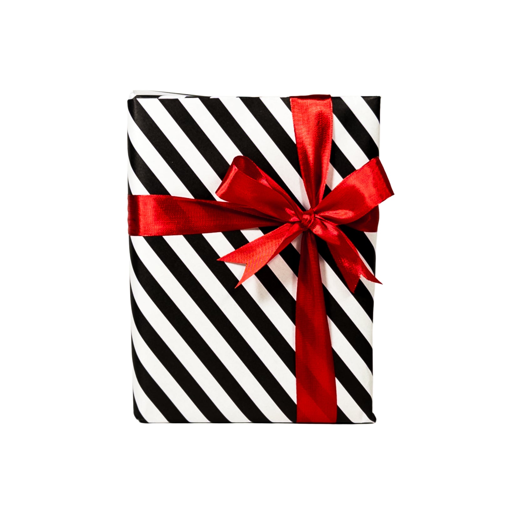 上質なストライプ柄のギフト包装紙に包み、仕上げにリボンをかけた特別仕様。