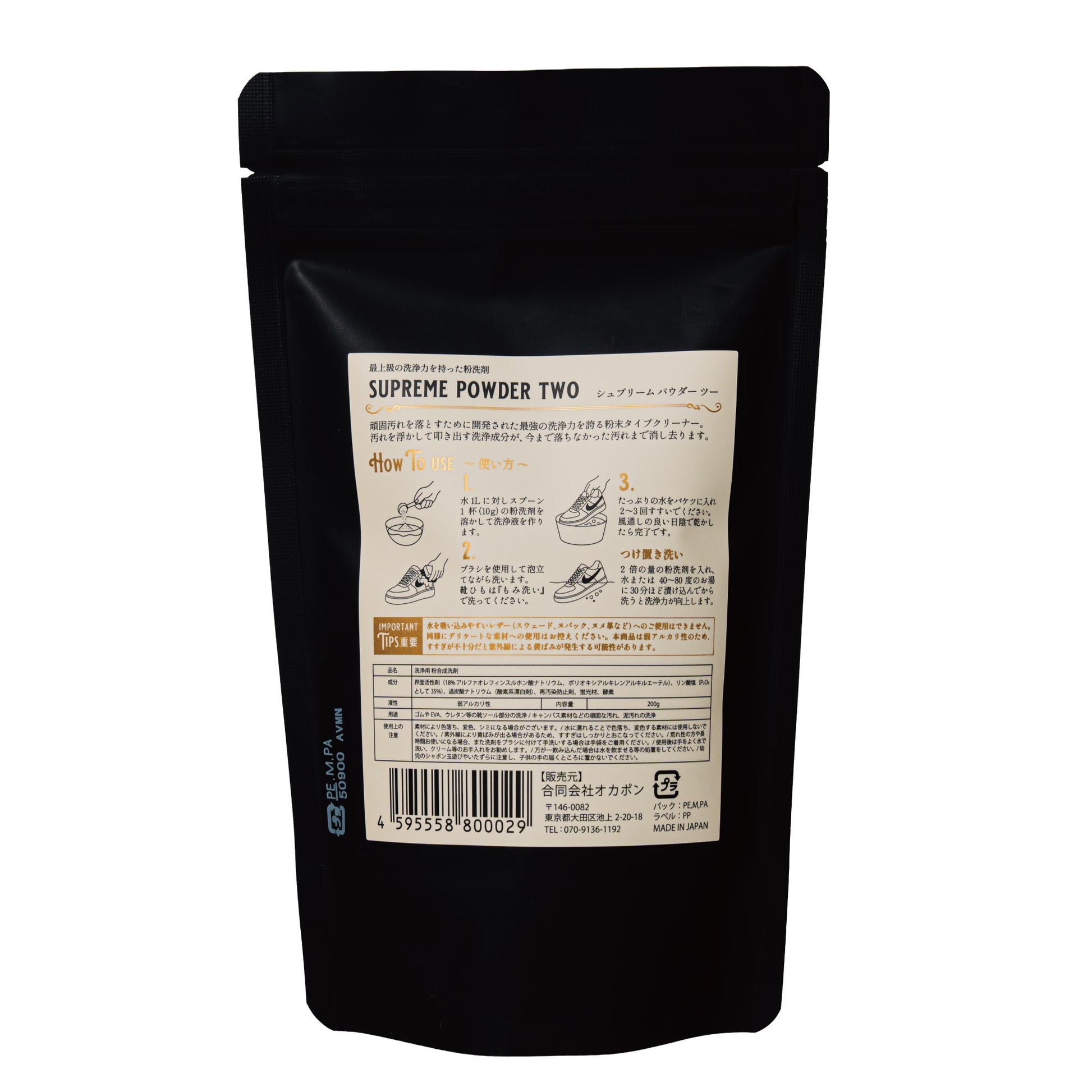 プロのスニーカークリーニング師・オカポンが、「地面からの汚れをもっと確実に落としたい」という声に応えて開発した強洗浄力粉洗剤Supreme Powder Two(旧MUDMAX)。泡タイプでは落とせないソールや靴ひもの奥に入り込んだ頑固な汚れを徹底的に除去するためにたどり着いた答えは"粉"でした。